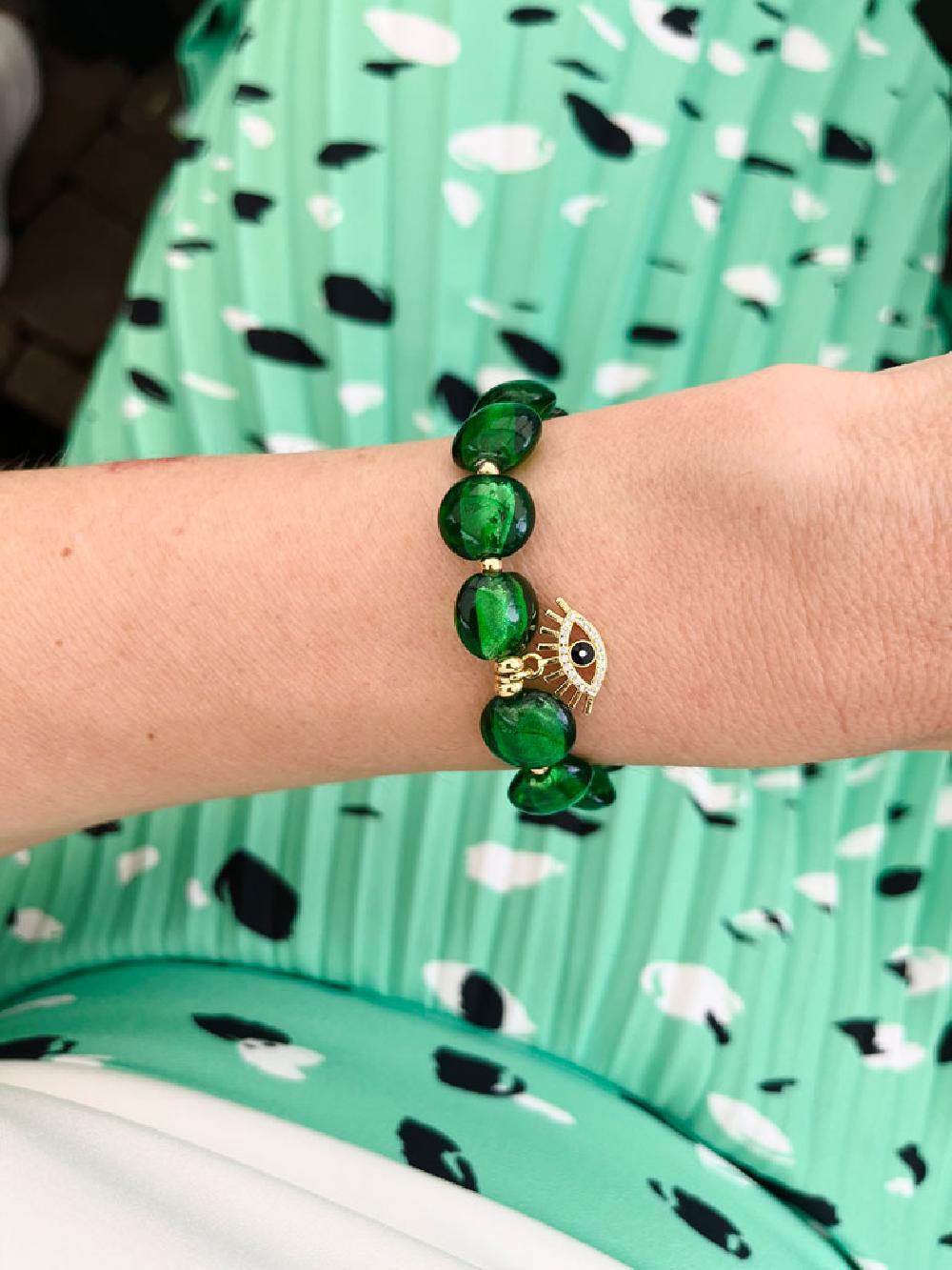 10mm-es üveggyöngyből készült karkötő, nemesacél kapoccsal, kiegészítőkkel és egy cirkóna köves Mati medállal. Mati, görögül szemet jelent. Egy amulett amely véd az ártó szemektől és gondolatoktól. Mérete: 17,5-18,5cm. Használati útmutató: vízzel, parfümmel, krémmel ne érintkezzen.